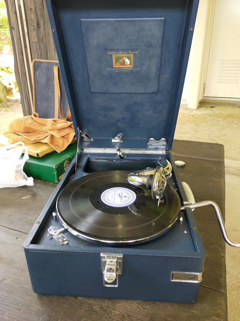 自分のイメージでは大きなラッパが付いている蓄音機のイメージでしたが、持ってきていただいたのは、コンパクトタイプでラッパはありません。それでも音は凄くしっかり出ます!!