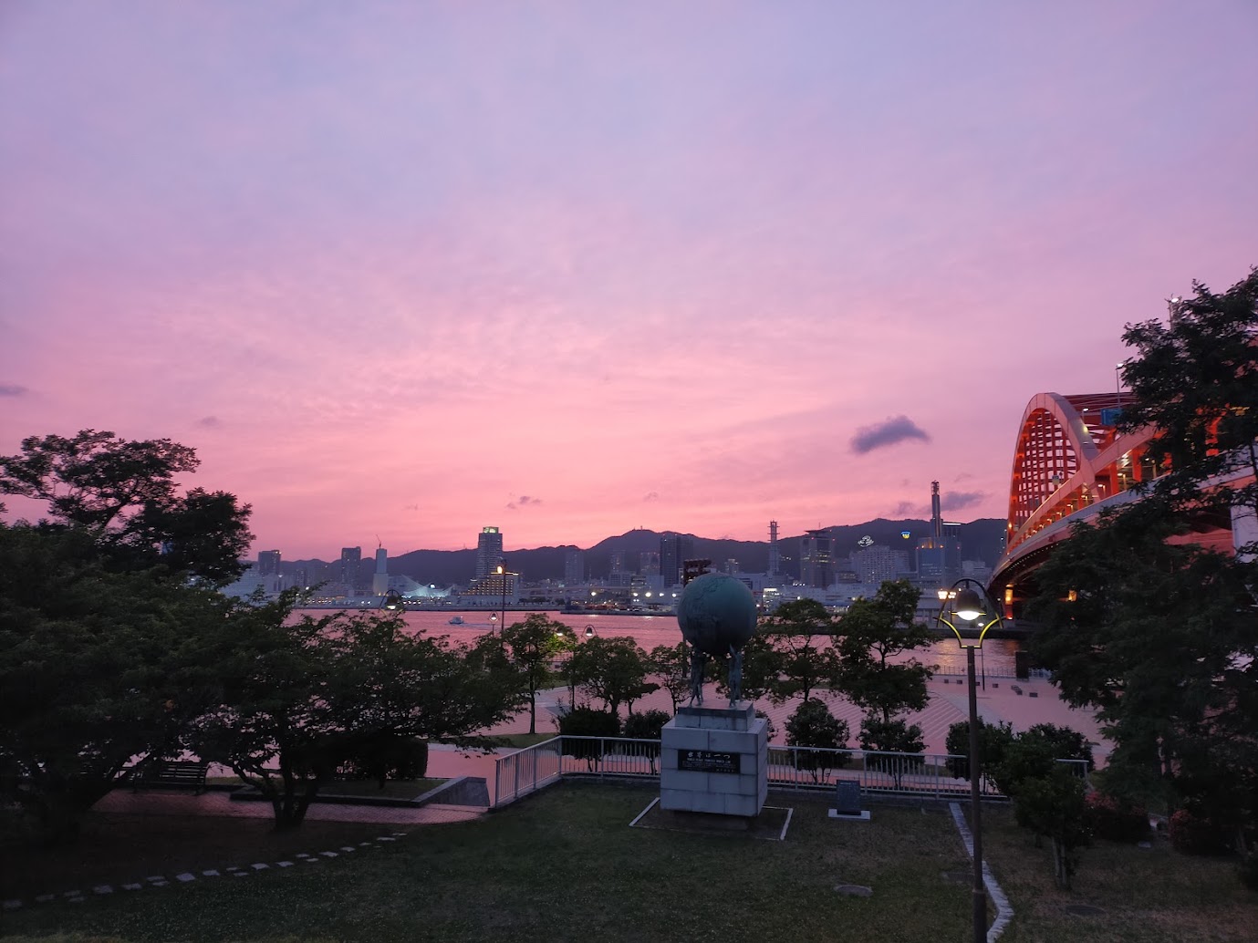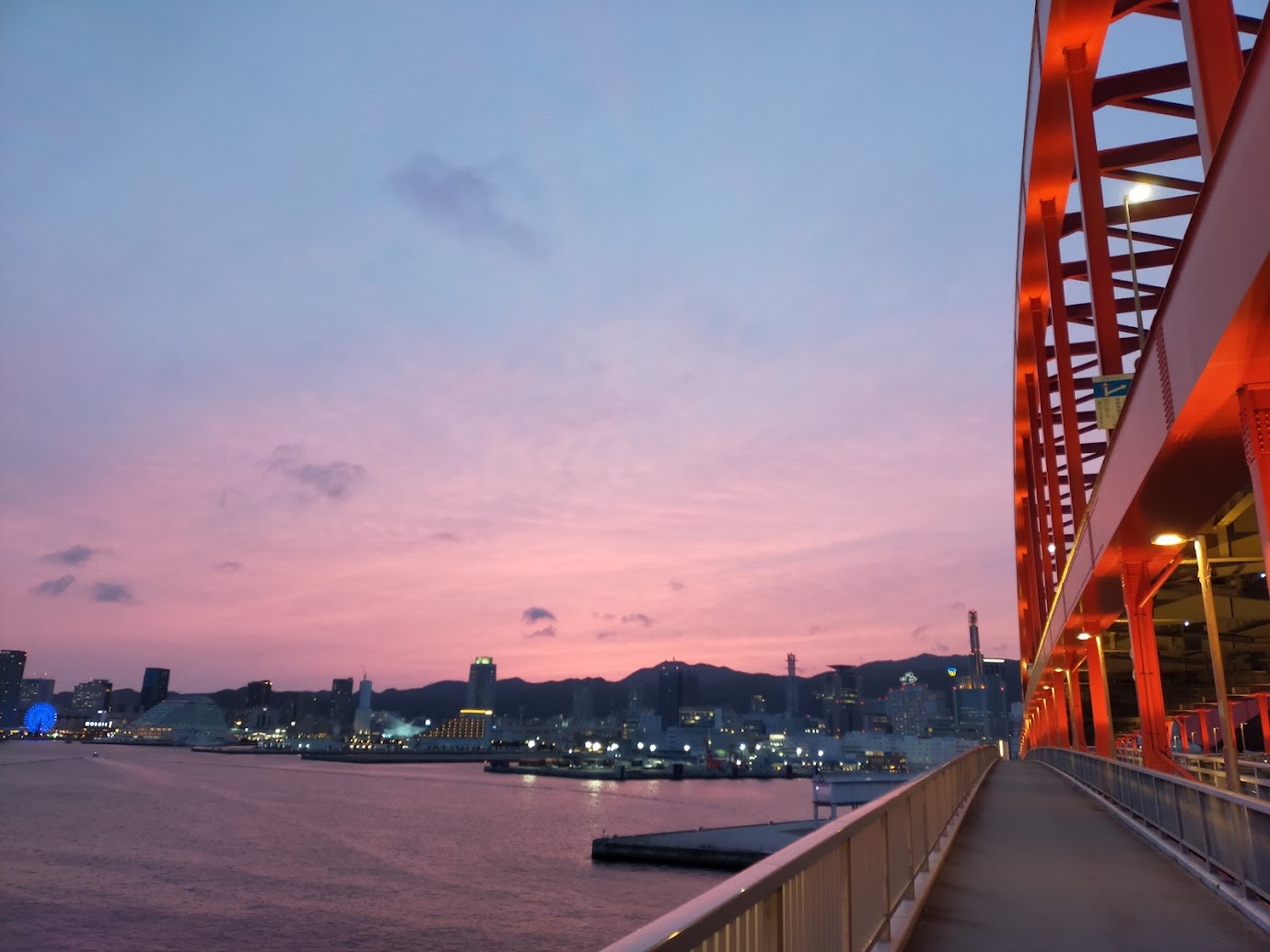 曇り空?と思いきや、帰りの神戸大橋では綺麗な夕景が。