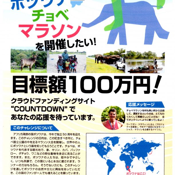 2016年3月19日 / 最終更新日時 : 2021年1月28日 永瀬 良輔 野生の象と走ろう ボツワナチョベマラソンを開催したい!! 先日、JICAシニアボランティアとしてボツワナ公務員大学の講師をされている伊藤さんからメールが届き、 ボツワナでマラソン大会するのにクラウドファンティングで100万円を集めるのに協力依頼がありましたので、報告を! ボツワ […]